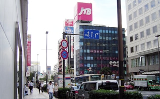 高島屋前を建物に沿って左折し、ひとつ目の交差点で右側への横断歩道を渡ります。 -